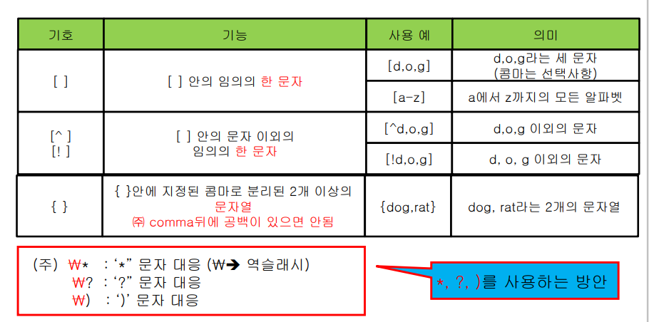 cp {*.doc,*.pdf} ~ : .doc 혹은 .pdf로 끝나는 모든 것을 사용자 홈 디렉토리로 복사함