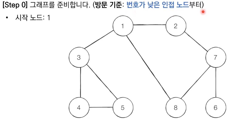 1. 탐색 시작 노드를 큐에 삽입하고 방문 처리를 한다.