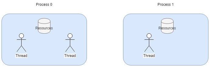 - 프로세스는 최소 하나 이상의 스레드를 가지며 경우에 따라 여러 스레드를 가질 수 있다(멀티스레드)