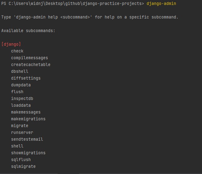 django을 시작하기 위해 install을 해주고 django-admin 명령어를 이용하여 프로젝트 주요 명령어를 실행