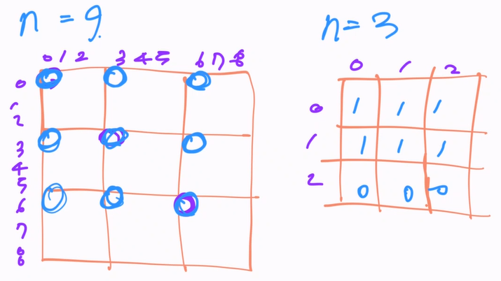 처음에 0,0으로 시작해서 0,0이 -1, 0, 1인지 기준을 잡은다음에 n x n까지 돌리는데