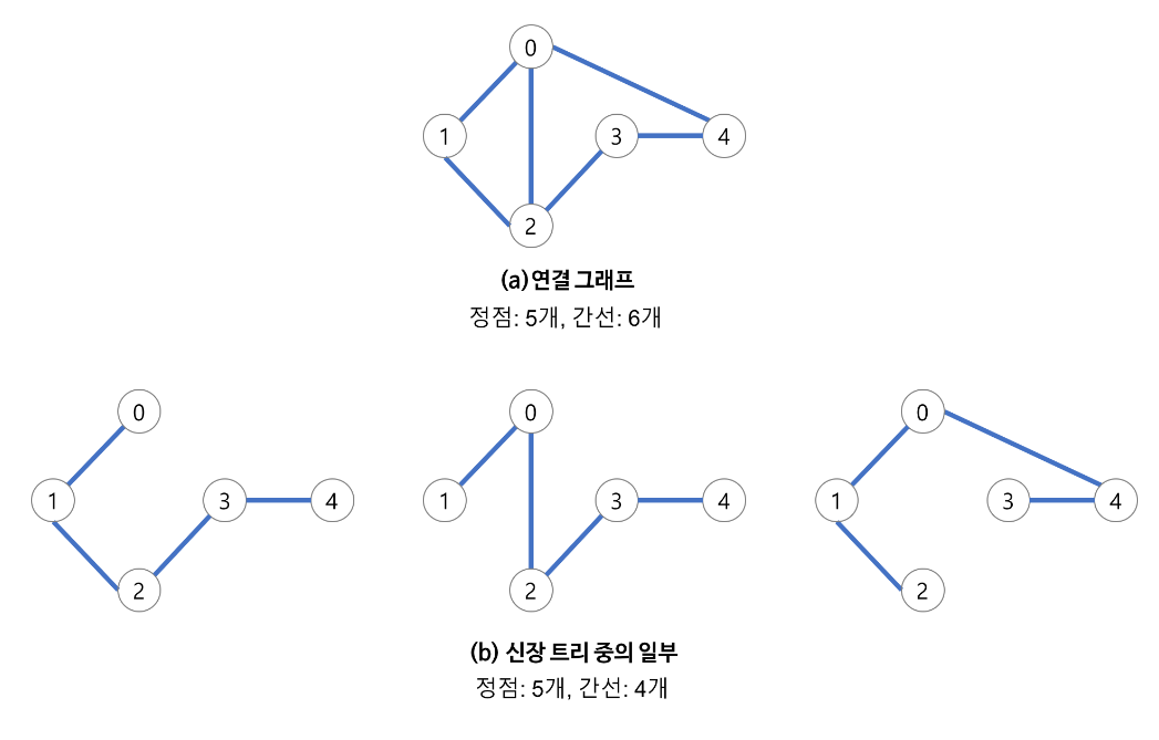 n개의 정점으로 이루어진 무향 그래프에서 n개의 정점과 n-1개의 간선으로 이루어진 트리