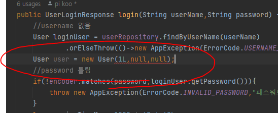 User user2 = new User("user2", "1234"); // @RequiredArgsConstructor