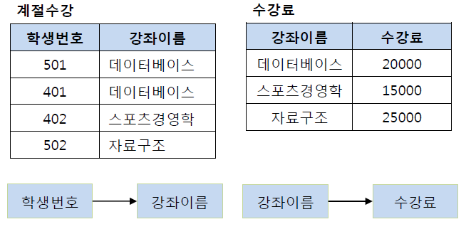 즉, 학생 번호를 통해 강좌 이름을 참조하고, 강좌 이름으로 수강료를 참조하도록 테이블을 분해해야 하며 그 결과는 다음의 그림과 같다.
