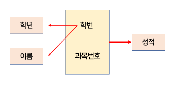 - 부분 함수 종속 : 기본키를 구성하는 속성의 일부에 종속되거나, 기본키가 아닌 다른 속성에 종속되는 경우
